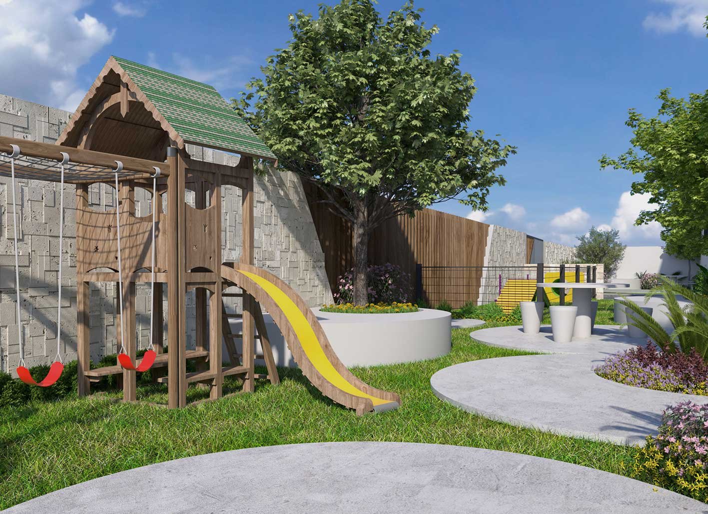 Cuando éramos niños amábamos jugar en el columpio o resbaladera. En Montalcino creamos un espacio para que los pequeños de la casa también puedan divertirse al aire libre, sin descuidar su seguridad.